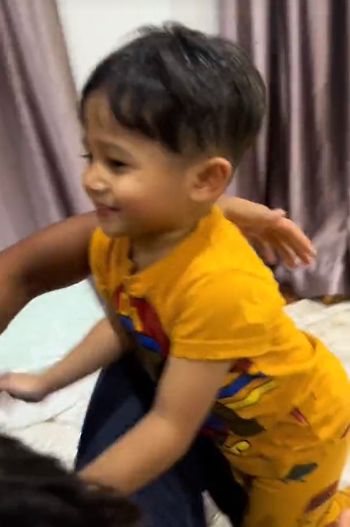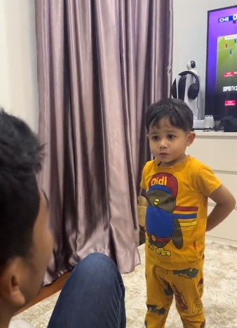 Haziq berlakon seolah-olah marah Hayder dan bertanya apakah Hayder sudah bersedia. Hayder pula elok sahaja berdiri sambil tangannya diletakkan di belakang. Muka Hayder kelihatan begitu cuak dan mengatakan ‘ sorry papa ‘. Haziq memang tegas dalam mendidik Hayder dan situasi sebegini selalu dapat dilihat antara anak dan ayah ini menerusi perkongsian sebelum ini.