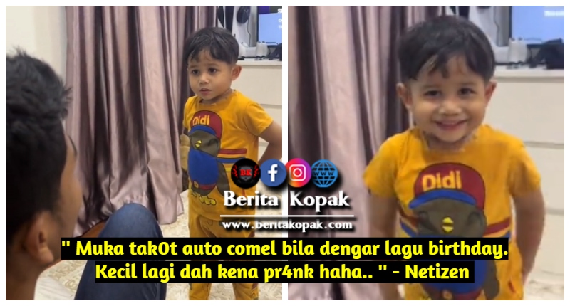 ” Muka takut auto comel bila dengar lagu birthday. Kecil lagi dah kena prank, haha.. ” – Netizen
