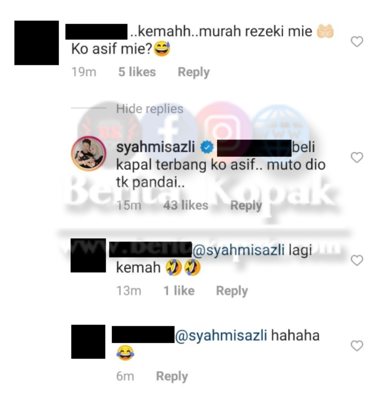 Pandai Syahmi ni yer buat lawak, terhibur bila baca respon Syahmi kepada netizen. Apa-apa pun, memang terbaik Syahmi, kami dari Berita Kopak mendoakan semoga Syahmi dimurahkan rezeki dan berjaya dalam bidang diceburi. Aamin.