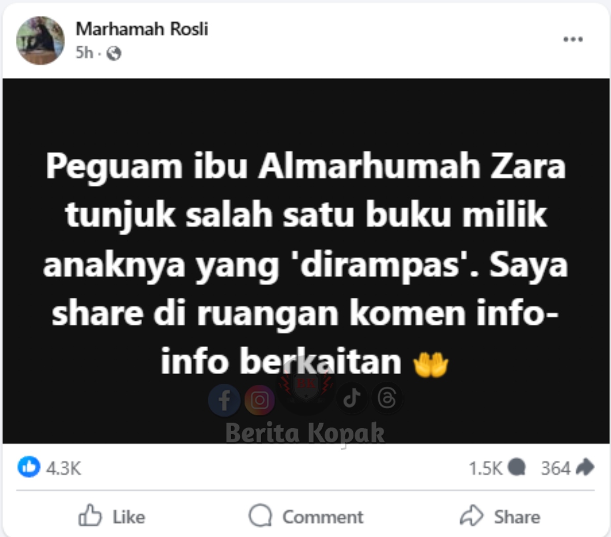 ” Peguam ibu Almarhumah Zara tunjuk salah satu buku milik anaknya yang ‘dirampas’.. ” – Ustazah Marhamah