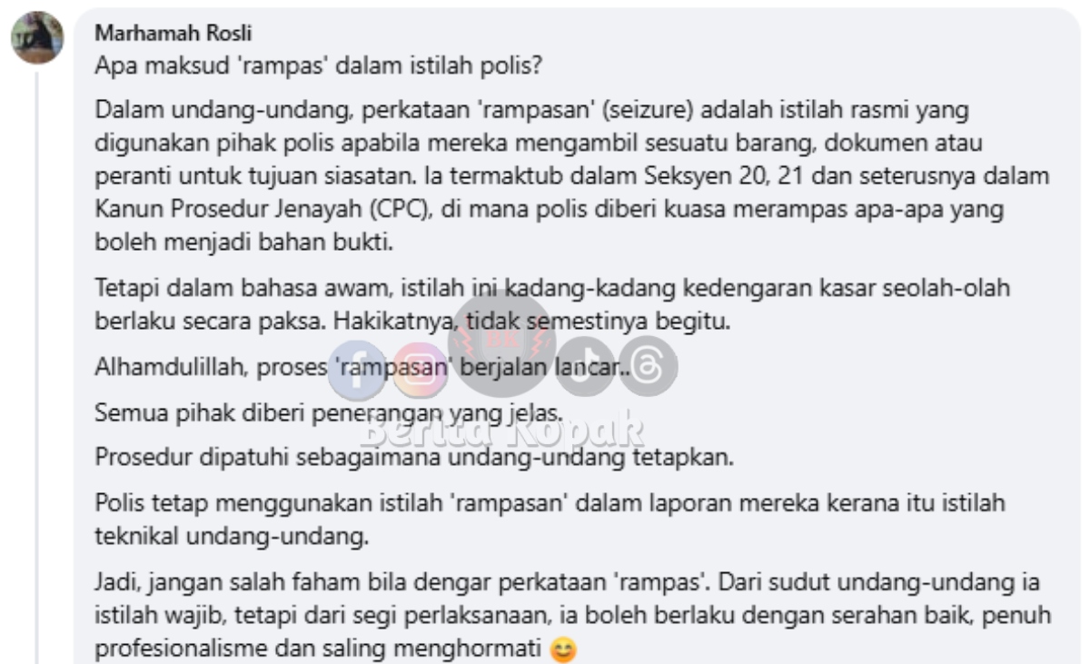 Mendengar perkataan ‘ rampasan ‘ dalam sidang media polis pastinya menimbulkan rasa tidak senang di kalangan orang awam kerana ianya kedengaran kasar dan seperti berlaku dalam keadaan paksa. Namun sebenarnya istilah ini adalah istilah rasmi yang digunakan dalam teknikal undang-undang.