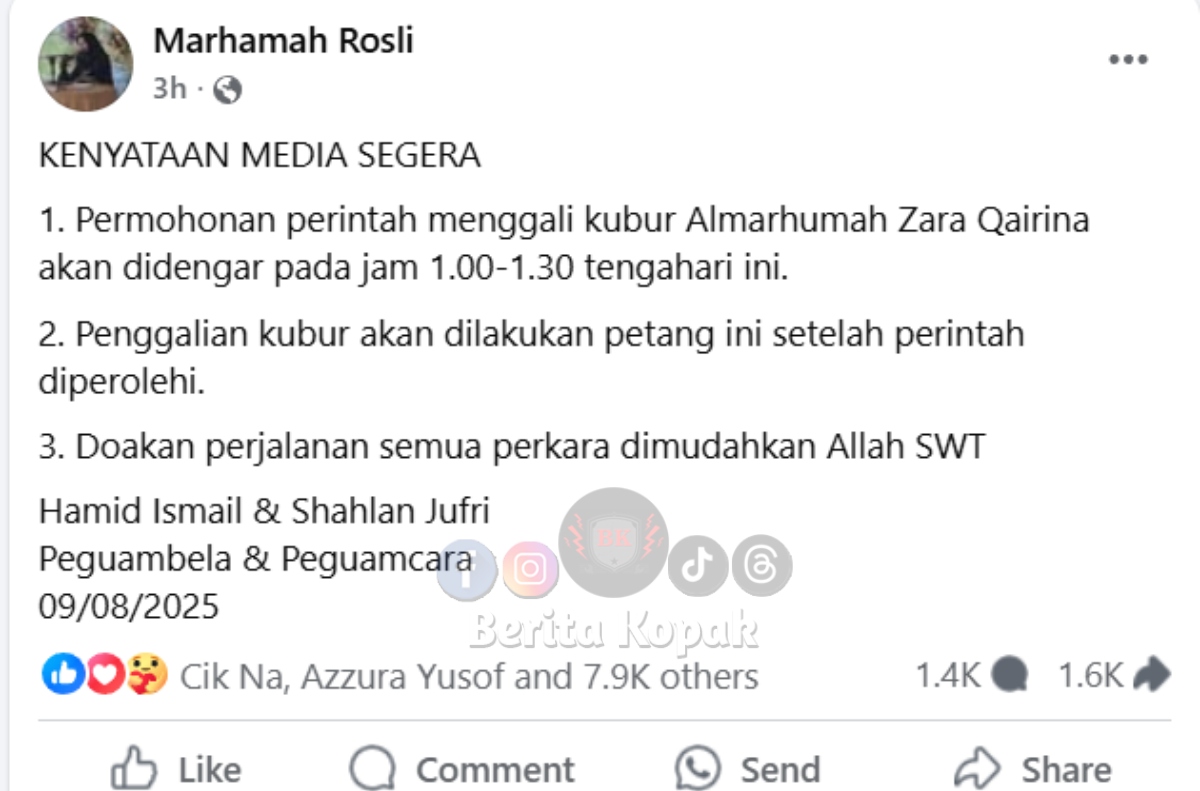 Menerusi perkongsian terbaru di akaun Facebook Marhamah Rosli, telah dikongsikan perkembangan terkini berhubung perintah tersebut. Hasil campurtangan daripada pihak atasan, kubur arwah Zara akan digali pada petang ini setelah perintah diperolehi.