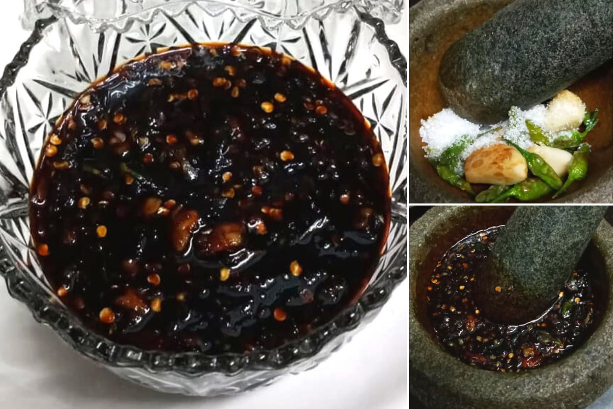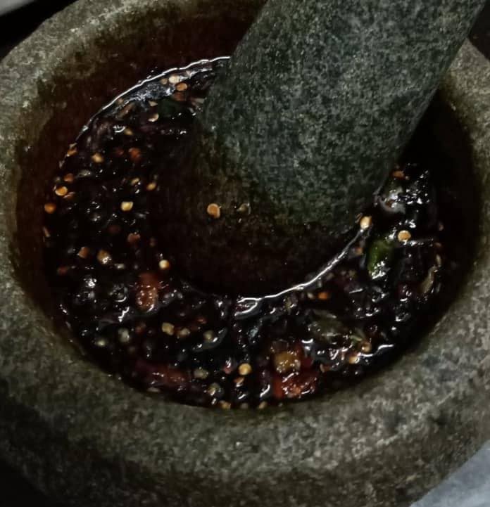 1. Goreng cili padi dan bawang putih menggunakan sedikit minyak, angkat kemudian masukkan ke dalam lesung batu.