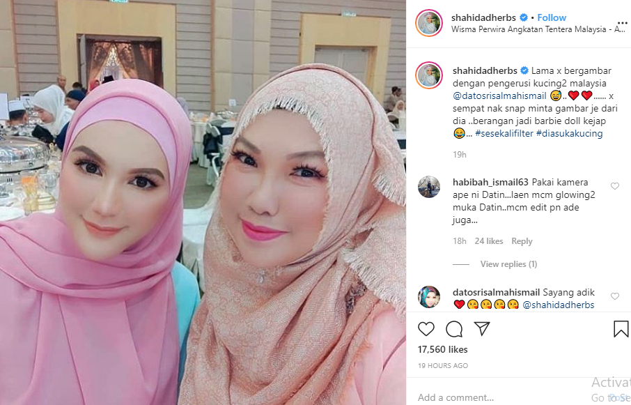 Menerusi akaun Instagram, Datin Shahida berkongsi gambarnya bersama Dato’ Sri Salmah Ismail. Wajah Datin nampak begitu berbeza dari biasa. Cantik dan nampak muda remaja sangat dengan kulit muka yang sangat licin dan mulus. Sekali pandang memang tak berapa nak cam lah..