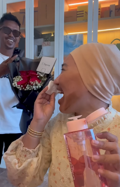 Namun tidak disangka, tiba-tiba Shuib hadir membawa sejambak bunga ros kepada Watie. Terkejut dengan hadiah yang dibawa oleh suami tersayang, Watie sempat menjerit teruja dan meluahkan tidak sangkanya. Menerusi kapsyen pula, tulis Watie, selalunya Shuib hanya memberikan sekuntum bunga sahaja.
