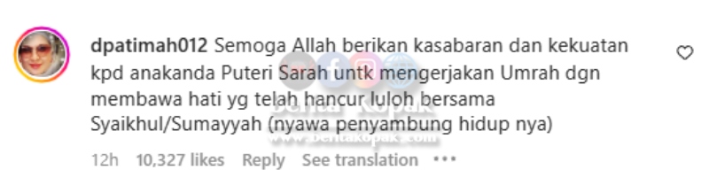 Semoga Puteri Sarah mendapat umrah yang mabrur dan dipermudahkan segala amal ibadatnya bersama anak-anak. Sesungguhnya Allah Maha Mendengar dan Maha Penyayang, pasti ada pelangi selepas hujan untuk Puteri Sarah dan anak-anak. Jaga diri selalu Puteri Sarah.
