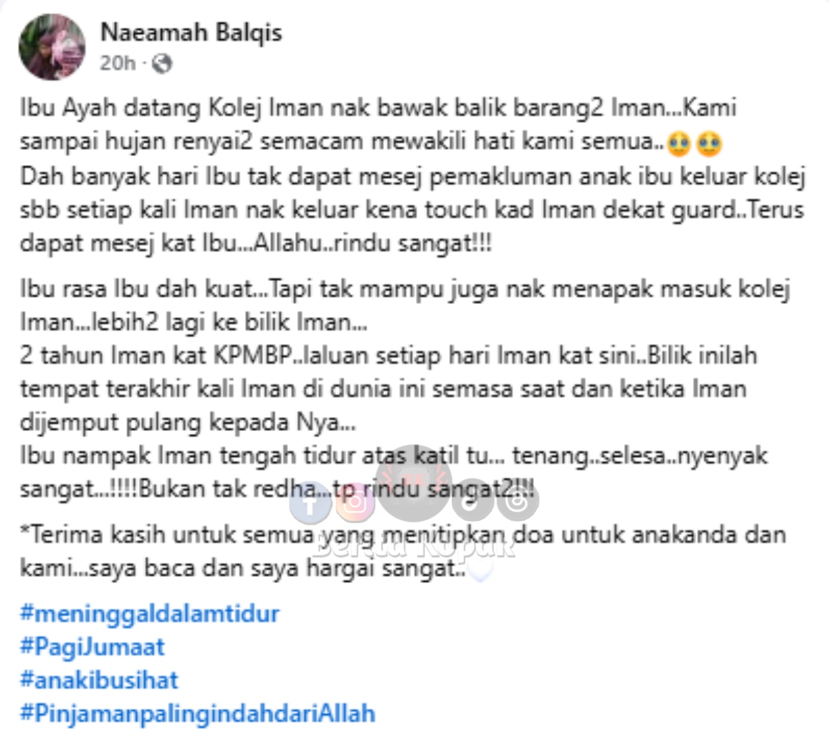 ” Allah…. sedih dan pilu sangat-sangat. Terus kuat dan tabah, ya Naeamah Balqis. Moga Arwah adik Iman ditempatkan dikalangan mereka yg beriman dan beramal soleh. Aamiin.. “