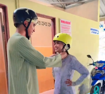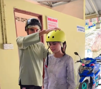 Ternganga Bella kerana terkejut apabila YB Saddiq mengetuk helmet yang berada di atas kepala Bella. Muka nakal YB Saddiq itu tidak dapat disorok lagi. Suka betul YB Saddiq mengusik ‘Yang Bella’nya tetapi mungkin juga YB ingin memastikan helmet itu betul-betul sesuai dengan kepala Bella.