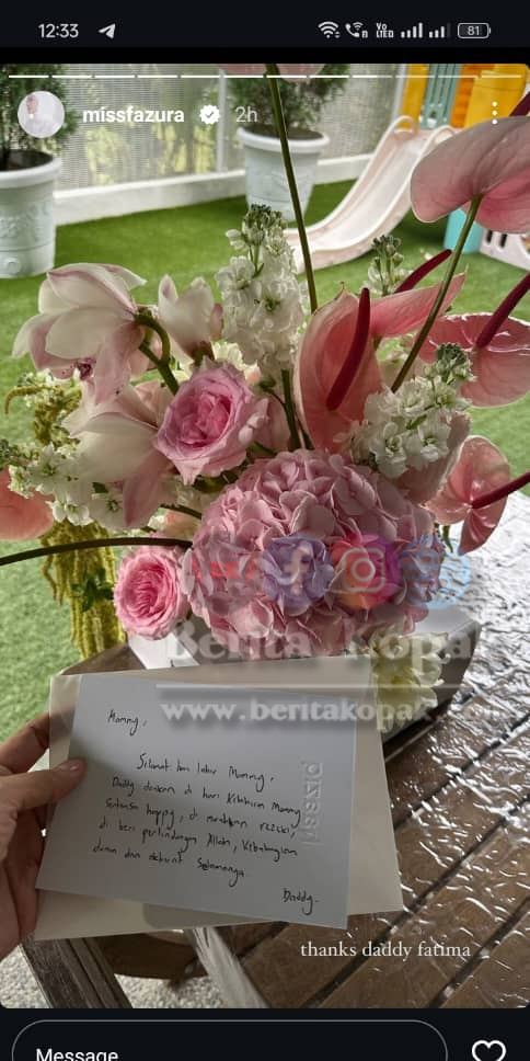 Fazura Kongsi Gambar Jambangan Bunga Pemberian Fattah Amin Sempena Hari Lahirnya. Cantiknya Bunga Daddy Bagi Dengan Mommy Fatima. Sweetnya Ucapan Fattah, Semoga Ada Sinar !!