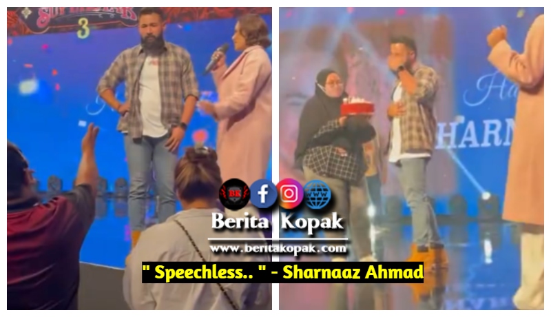 Sharnaaz yang langsung tidak menyedari akan perancangan ini nampak benar-benar terkej0t tahkala muzik dan nyanyian lagu happy birthday berserta gambar di belakang pentas menunjukkan wajahnya.