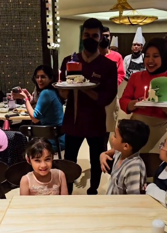 Turut sama kelihatan adalah bapa dan ibu mertua Puteri Sarah, Datuk Yusuf Haslam dan Datin Patimah. Suasana mula meriah apabila beberapa orang pekerja restoran itu membawa 2 biji kek ke arah tempat duduk Sumayyah sambil menyanyikan lagu happy birthday.