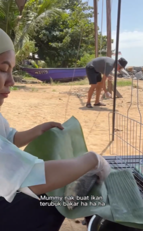 Wira yang petah bercakap ini menyebut satu per satu step untuk memasak mengikut gerakan mommynya itu. Betty membalut ikan terubuk itu dengan daun pisang dan kemudian membak4rnya tetapi respon Wira ketika melihat ikan yang sudah siap dibak4r mencuit hati ramai.