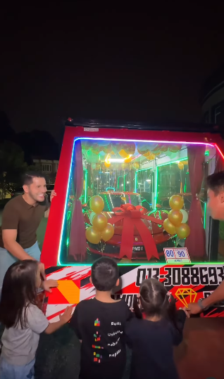 Dato’ Aliff memanjat rasa syukur dan berterima kasih kepada isterinya kerana hadiah yang cukup bermakna buatnya. Kereta tersebut dibawa dalam sebuah lori bercermin dan dihiasi seperti sebuah hadiah. Anak-anak Dato’ juga turut teruja.