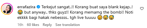 Perkongsian video ini telah menerima lebih tiga ribu tanda suka daripada warganet sejak ia dimuatnaik buat masa ini. Erra juga meninggalkan komen di ruangan komen dengan mengucapkan terima kasih terhadap kejutan yang diberikan.