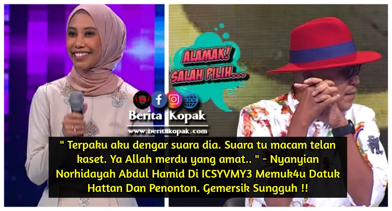 Menerusi akaun Instagram Senang Terhibur, telah dikongsikan sedutan video bagi peserta bernama Norhidayah Abdul Hamid. Siapa sangka air muka masam yang dipamerkan di atas pentas semalam membuatkan Datuk Hattan menyangka dia penyam4r. Apabila dia mula menyanyi ramai yang tergamam dengan kemerduan suaranya.
