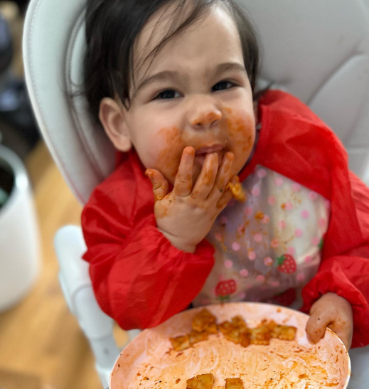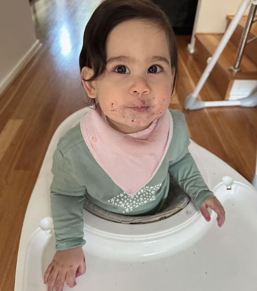 Talita yang sedang duduk di atas kerusi makannya kelihatan sedang tidur lena. Dengan tangan dan mulut yang com0t, masih ada lagi baki makanan yang belum dihabiskan oleh Talita. Ini gayanya terlebih kenyang sampai boleh tertidur sewaktu sedang makan.