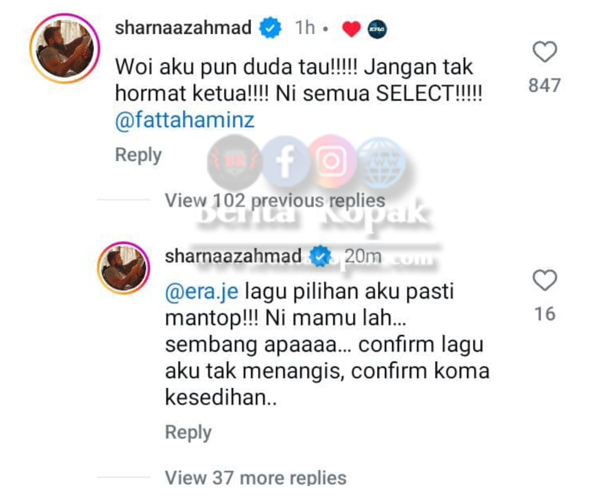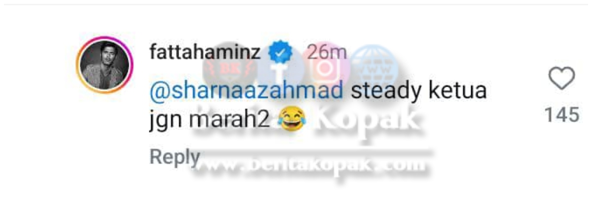 Memandangkan Fattah kini diberikan jolokan Duda Hot, Sharnaaz juga berseloroh di komen mengusik Fattah Amin. Apabila ketua duda-duda semalaya bersuara, ramai sungguh yang menyukai komennya itu. Fattah juga turut memberikan respon kepada komen Sharnaaz itu.