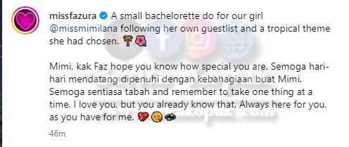 Meninjau ke akaun Instagram Fazura, perkongsian beberapa keping gambar sekitar Bachelorette Party pelakon Mimi Lana telah meraih perhatian ramai. Mimi bakal mendirikan rumahtangga tidak lama lagi bersama pelakon, Syafiq Kyle.