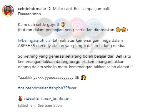 Sebelum ini tular satu p0sting Dr. Malar yang menuntut janji daripada Bell setelah menang Bintang Paling Popular dalam Anugeran Bintang Popular Berita Harian baru-baru ini. Sebelum ini, Bell berseloroh yang dia akan belanja makan tengahari pada bulan Ramadhan menerusi manifestonya.