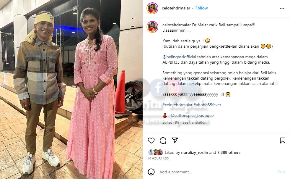 Gambar Dr. Malar bertemu dengan Bell telah dikongsikan di p0sting terbaru Dr. Malar di instagram. Perkongsian ini telah menerima lebih 7 ribu tanda suka daripada warganet sejak ia dimuatnaik. Dr. Malar juga turut mengucapkan tahniah buat Bell.