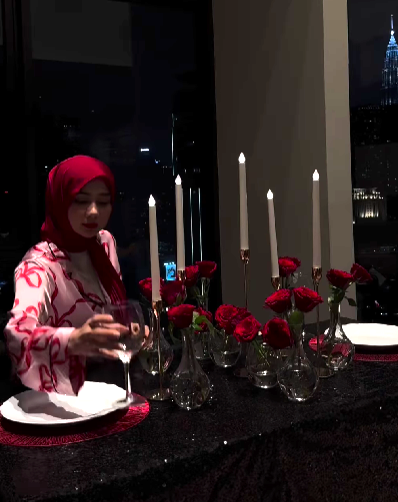 Wawa telah menghiasi bunga-bunga ros segar dan beberapa batang lilin di atas meja makan untuk menaikkan suasana romantik makan malam bersama Aeril. Bukan itu sahaja, di bawah lantai juga Wawa menaburkan kepingan kelopak bunga ros sebagai penanda jalan menuju ke meja makan.