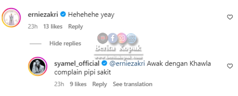 Rupanya ada sebab lah Syamel mengubah imejnya tu. Cute sahaja cara Syamel respon komen Ernie. Apa-apa pun memang nampak Syamel lebih handsome dan lebih muda tanpa misai dan janggut. Harapnya Ernie dan Khawla tak complaint lagi pipi akan sak1t selepas ni, hehe.