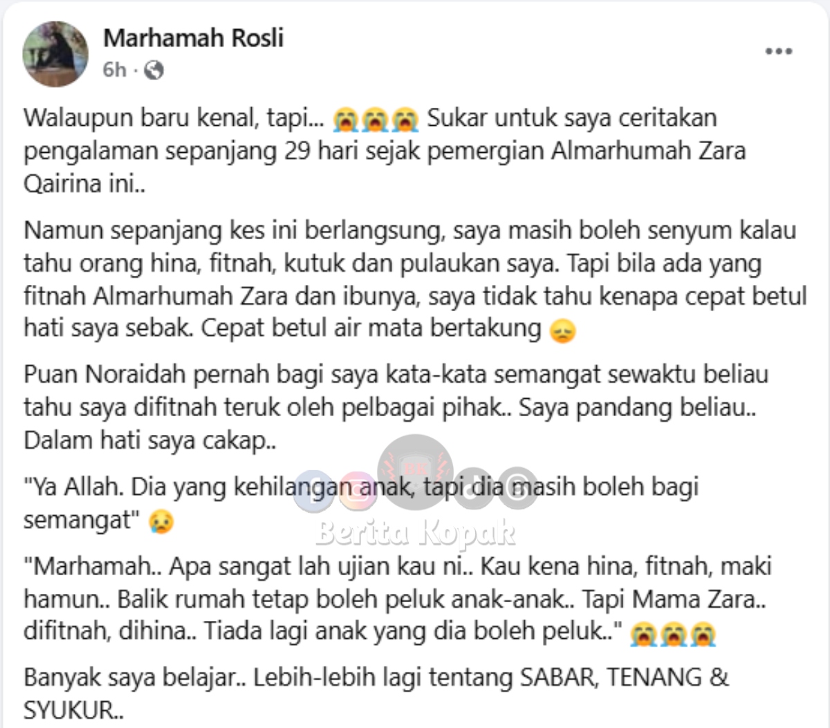 ” Menitis air mata Ustazah Ya Allah kuatkan hati ibu Zara.. Moga Allah permudahkan segala urusan membawa mereka ke muka pengadilan dan di hukum dengan sekeras keras hukuman Insyallah.. “