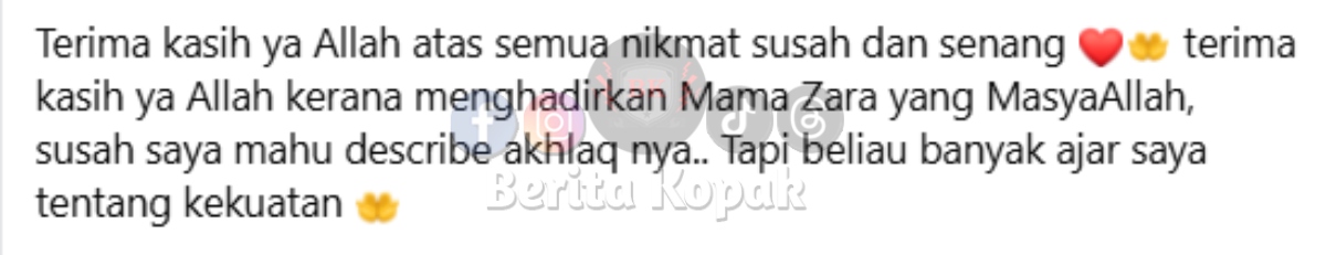 ” Subhanallah MasyaAllah.. Saat membaca nukilan ustazah pon , meraung sudah sy . Benar. Sy belajar banyak dr akhlak ibu arwah Zara. Dia sangat tenang tp tegas . Dia tidak meraung mcm jika kita yg d uji sebegitu . Dia lemah lembut tidak menghukum , tidak berkata balas walaupon dia di fitnah. Dan inilah arwah Zara, satu²nya anak yg dia ada di dunia ini . Dia ibu tunggal yg Allah angkat martabatnya dgn setingginya.. “