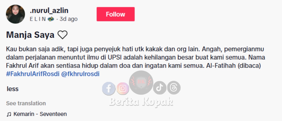 Keluarga Fakhrul pastinya yang paling terkesan dengan kehilangan Fakhrul. Menerusi perkongsian di akaun Tiktok .nurul_azlin, telah dikongsikan satu posting yang dicoretkan oleh kakak Fakhrul sendiri, Elin. Hati kakak mana yang tidak sedih apabila adik tersayang pergi untuk selama-lamanya.